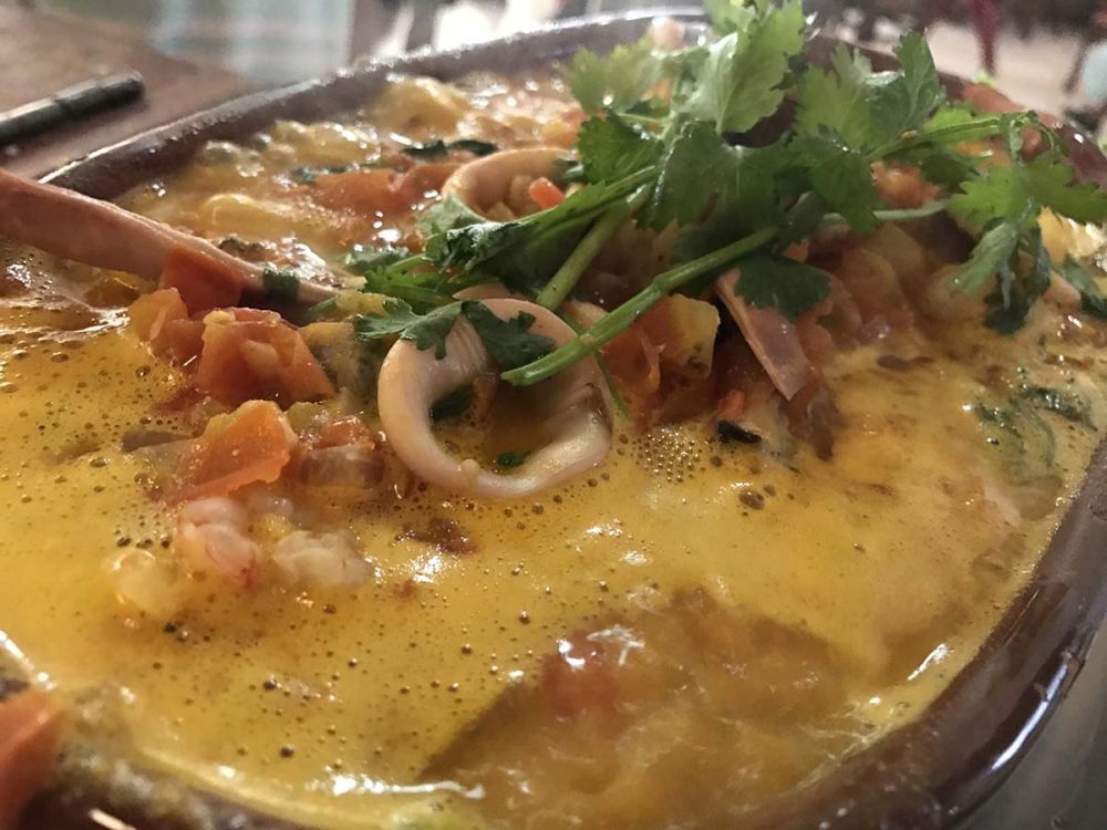 peixe cozido com tomate, cebola, leite de coco, azeite de dendê, cheiro verde, coentro e pimentão amarelo, acompanha arroz branco, farofa de dendê e pirão.