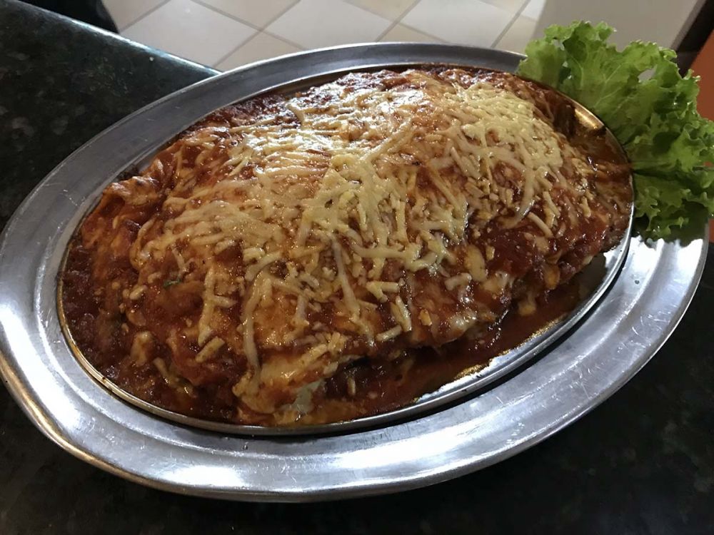 filé mignon frito à milanesa, coberto com mussarela, molho ao sugo, parmesão, vai ao forno para gratinar, acompanha arroz branco e fritas