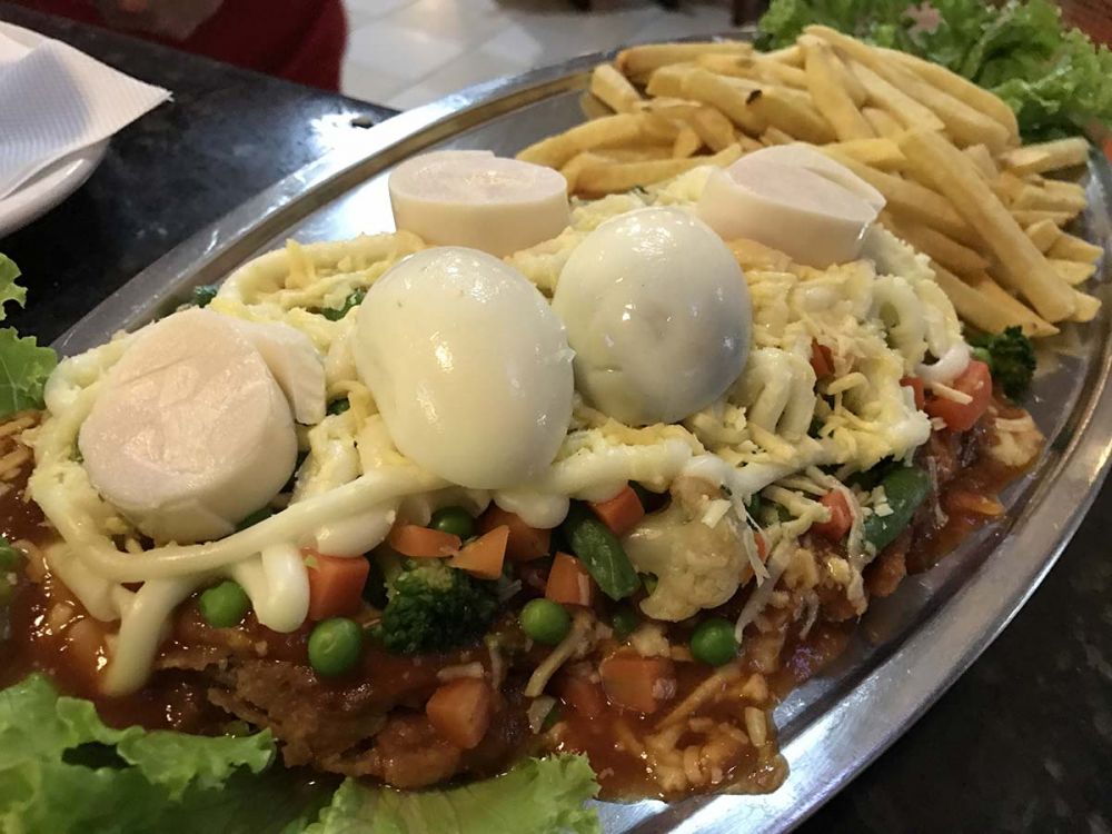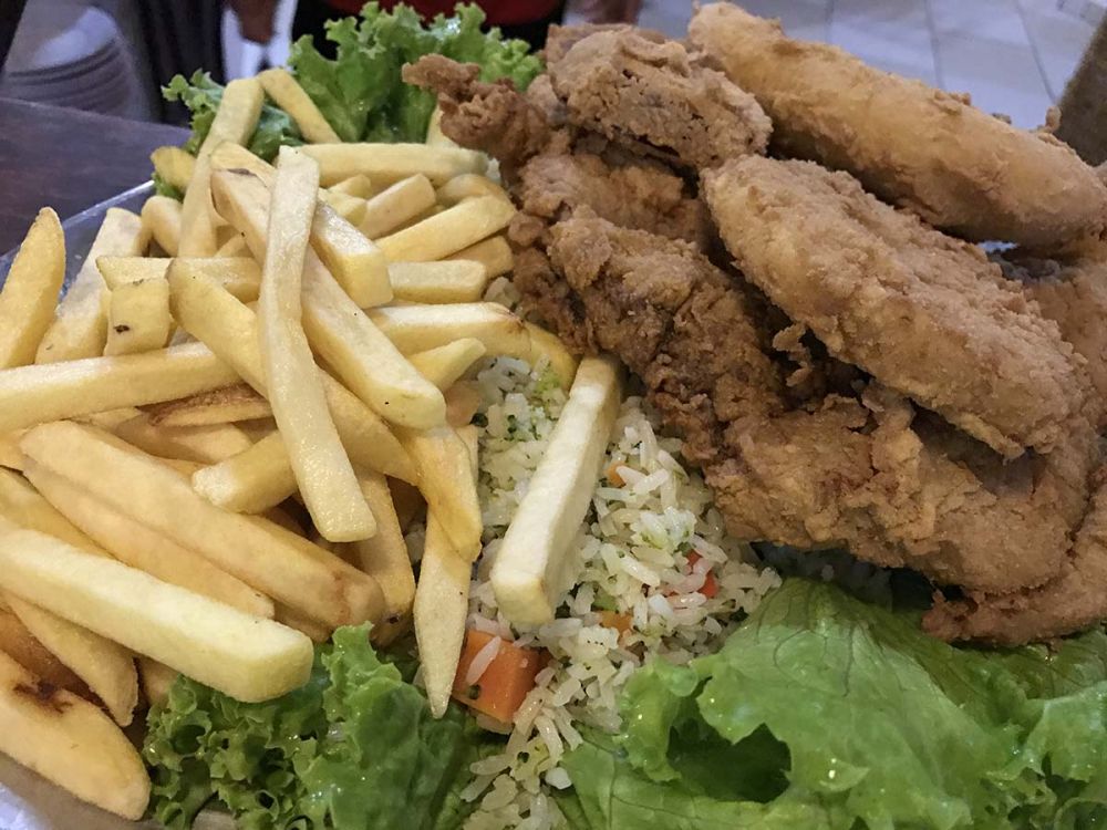 filé mignon frito à milanesa, acompanha banana à milanesa, abacaxi à milanesa, maça à milanesa, arroz a grega e fritas.