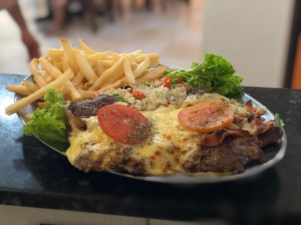 filé mignon grelhado na chapa coberto com cebola frita, bacon, mussarela, tomate, orégano, vai ao forno para gratinar, acompanha arroz à grega e fritas.