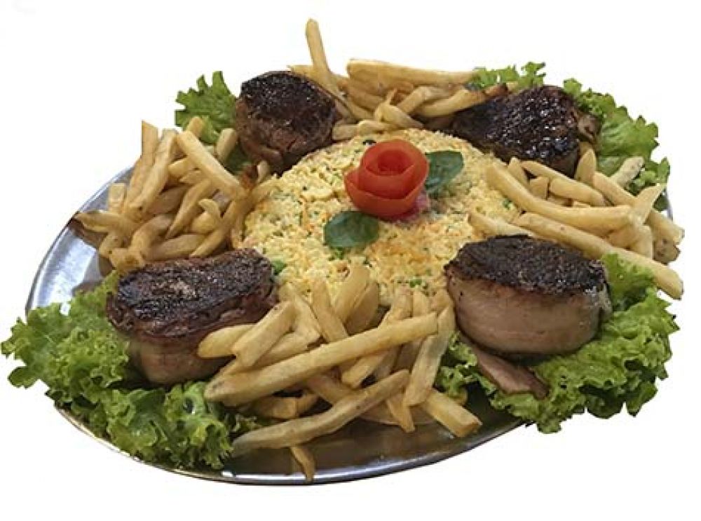 4 toletes de filé mignon envolvido com tiras de bacon grelhado na chapa, acompanha arroz a piamontes e fritas.
