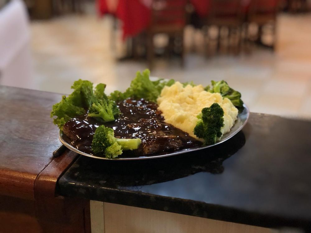 filé mignon grelhado na chapa, coberto com molho shoyu, champignon, purê de batata, acompanha arroz branco e brócolis.