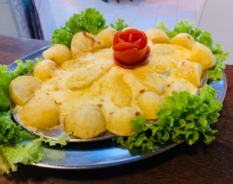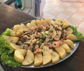 Abadejo a Leobaldo - Filé de Abadejo grelhado na chapa coberto com banana grelhada, molho bechamel, muçarela, banana na decoração, salpica parmesão, vai ao forno a 400ºg para gratinar, acompanha batata corada e arroz. o prato serve 2 pessoas. Uma delicia de prato que tem a mistura do salgado com o doce em uma perfeita combinação. Fica a dica para a próxima refeição.
